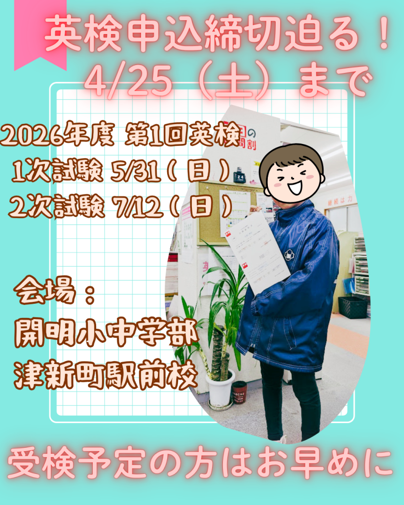 2026年度第1回英検のお申し込み締切が近づいてきました。