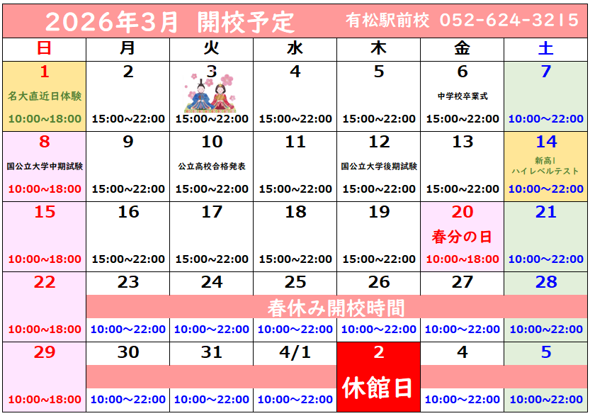 有松駅前校は名鉄有松駅徒歩1分。明るく風吹き抜ける快適学習空間です。高校近くではないので、様々な高校の生徒さんが、学校帰りに毎日勉強に来るほか、夏休み期間などもコンスタントに学習する場として活用しています。お正月も休みなく努力を重ねてきた受験生からは、私立大学合格の報が続々と届いていて、あとは国公立大学前期日程の発表と後期日程を残すのみとなりました。いよいよ、新高3生が校舎の主役となる代替わりの時です。新高3・新高2生のみなさんは、本当に進級する4月以降を順調に過ごすためには、この3月のまでの過ごし方がとても重要です。いつから心から「受験生」になるかが、1年後、2年後の運命を分けると言ってもよいでしょう。何から始めたらいいのかわからないという方、大学入試についてよくわからない方、お気軽にご相談ください。個別相談・見学・無料体験などはインターネットでお申込みいただいたのちにも、校舎とスケジュール調整して参りますので、直接ご連絡いただくのが最もスムーズです。お電話お待ちしています。