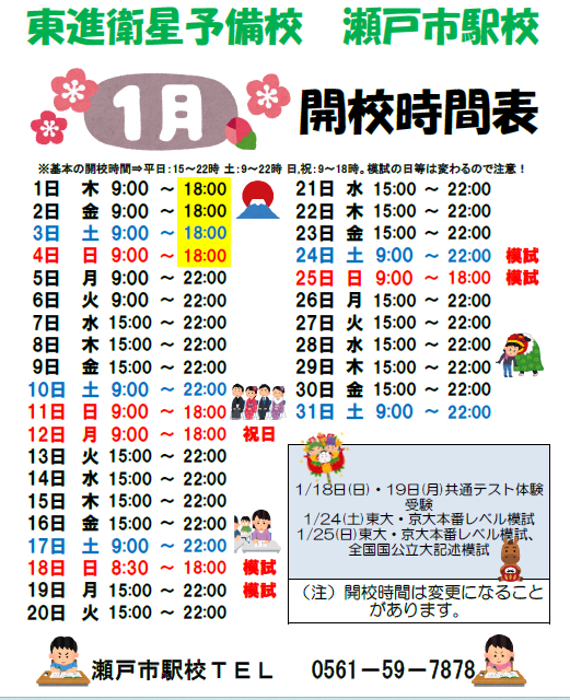 大学受験は人生の通過点でしかありません。しかし、高校生活の最後に訪れる大きな節目に向けて自分の夢や目標のために努力し、実現することは人生の貴重な糧となるはずです。 瀬戸市駅校でも生徒たちは必死に学習し受験本番へ準備をしています。 合格のためにもっと頑張りたい、大学入試が不安、目標は曖昧だけど・・そんなみなさん、私たちと一緒に挑戦してみませんか? 瀬戸市駅校スタッフ一同、精一杯サポートしていきます。
