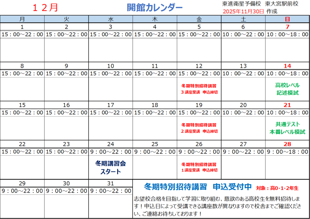 高校0・1・2年生対象、冬期特別招待講習受付中!!有名講師の授業がどのようなものか、気になりませんか?行きたい大学や学部があるけど、何から手を付ければいいか分からない方、一緒に学習設計図を立てませんか?授業も校舎の雰囲気も体験できる絶好の機会です!まずは校舎までご連絡ください。すべての学年、東進でお手伝いできますよ!