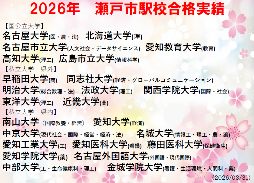大学受験は人生の通過点でしかありません。しかし、高校生活の最後に訪れる大きな節目に向けて自分の夢や目標のために努力し、実現することは人生の貴重な糧となるはずです。 瀬戸市駅校でも生徒たちは必死に学習し受験本番へ準備をしています。 合格のためにもっと頑張りたい、大学入試が不安、目標は曖昧だけど・・そんなみなさん、私たちと一緒に挑戦してみませんか? 瀬戸市駅校スタッフ一同、精一杯サポートしていきます。