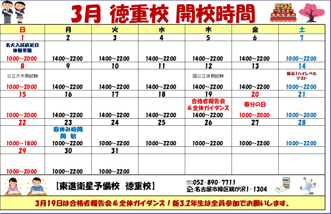 中学受験、高校受験と異なり、大学受験では必要とされる勉強の量・質ゆえに、今まで経験したものとは比較にならいほど高度な自己管理能力や計画能力、またそれらを実行に移す力が必要になります。 「受験は常に自分との戦い」です。皆さんが日々自分に負けず、受験勉強を頑張れるよう、徳重校ではスタッフ全員で背中を押していきます。 一緒に第一志望合格を目指しましょう!