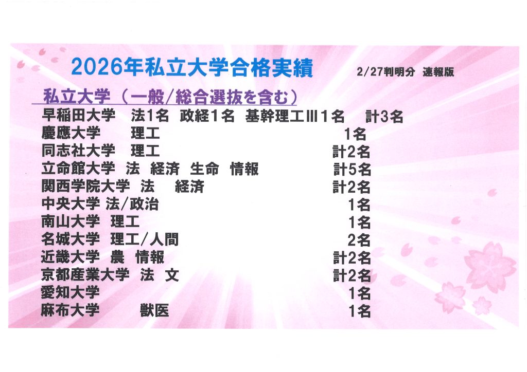 校舎長の五藤です。私大入試の結果がほぼ出そろいました。 国公立。これで受験は終盤。先輩たちに続くこれから受験生になる皆さんに。様々な講座・面談で皆さんの学習をバックアップできます。新高2・3生の方新年度招待講習の受付中!!