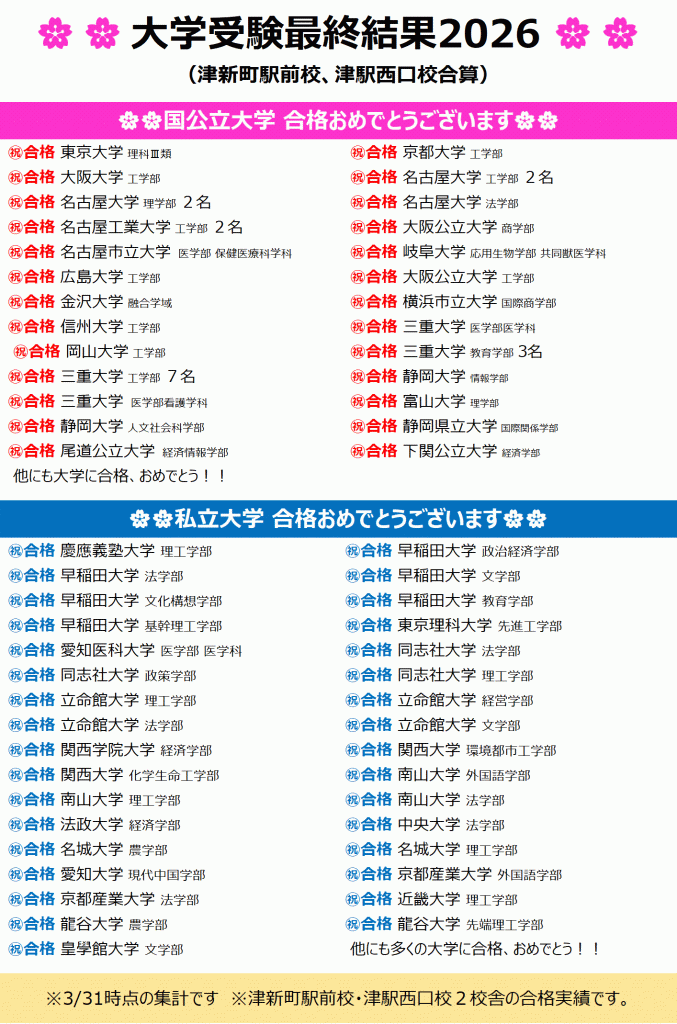 志望校に合格できた新高1生の皆さんは油断しないように、不本意な結果になってしまった人は3年後の大学入試で挽回できるように、今から頑張っていきましょう。