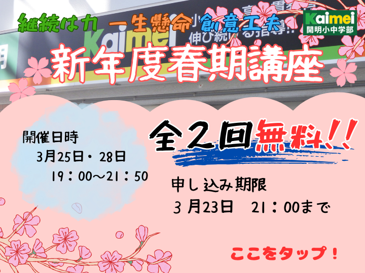 開明では、春休みの2日間中学1年生の内容を少しだけ予習をしていきます。ご興味のある方は是非ご連絡をください。