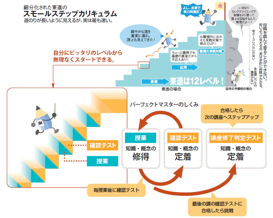 スタートのレベルは人それぞれ。東進なら高校入門から超東大までの12段階から自分に合った講座のレベルを選ぶことが可能です。また、1講座は20回で構成され、内容を理解しながら確実にステップアップできます。習ったことを確実に身につける 『パーフェクトマスター』