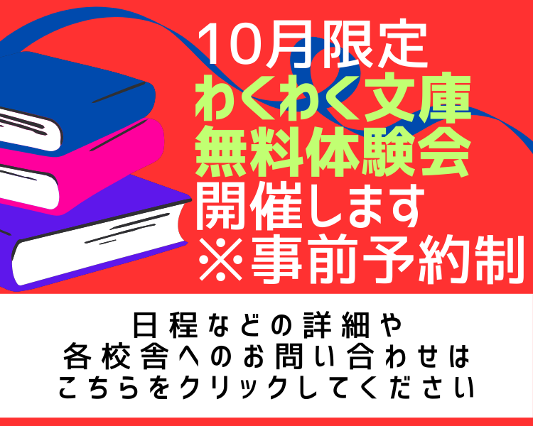 | 9/27 | わくわく文庫、無料体験会受付中!(10月の土曜実施、日程は各校舎によって異なります詳しくはこちら)new |