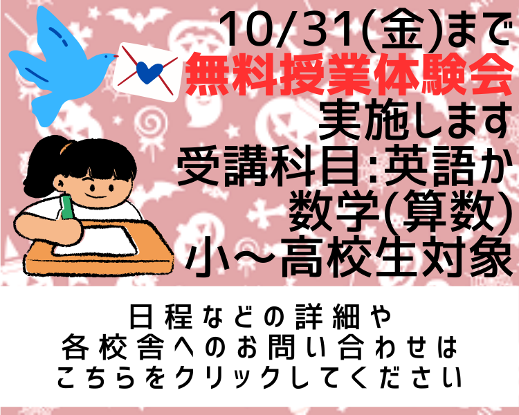 | 9/27 | 無料授業体験会実施します!10/31まで!お問合せはこちら!new |