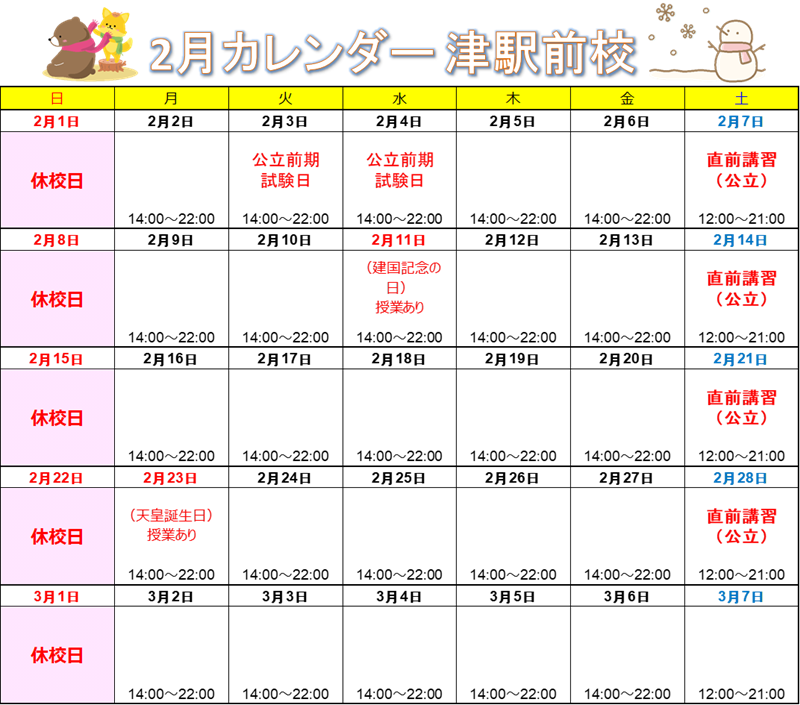 ◯受験シーズンはいよいよ最終局面です。開明とぴあ津駅前校では、受験生が最後まで万全の状態で臨めるよう、祝日も通常通り授業を実施しています。直前期は一日一日の積み重ねが結果に直結します。限られた時間を最大限活かしましょう。