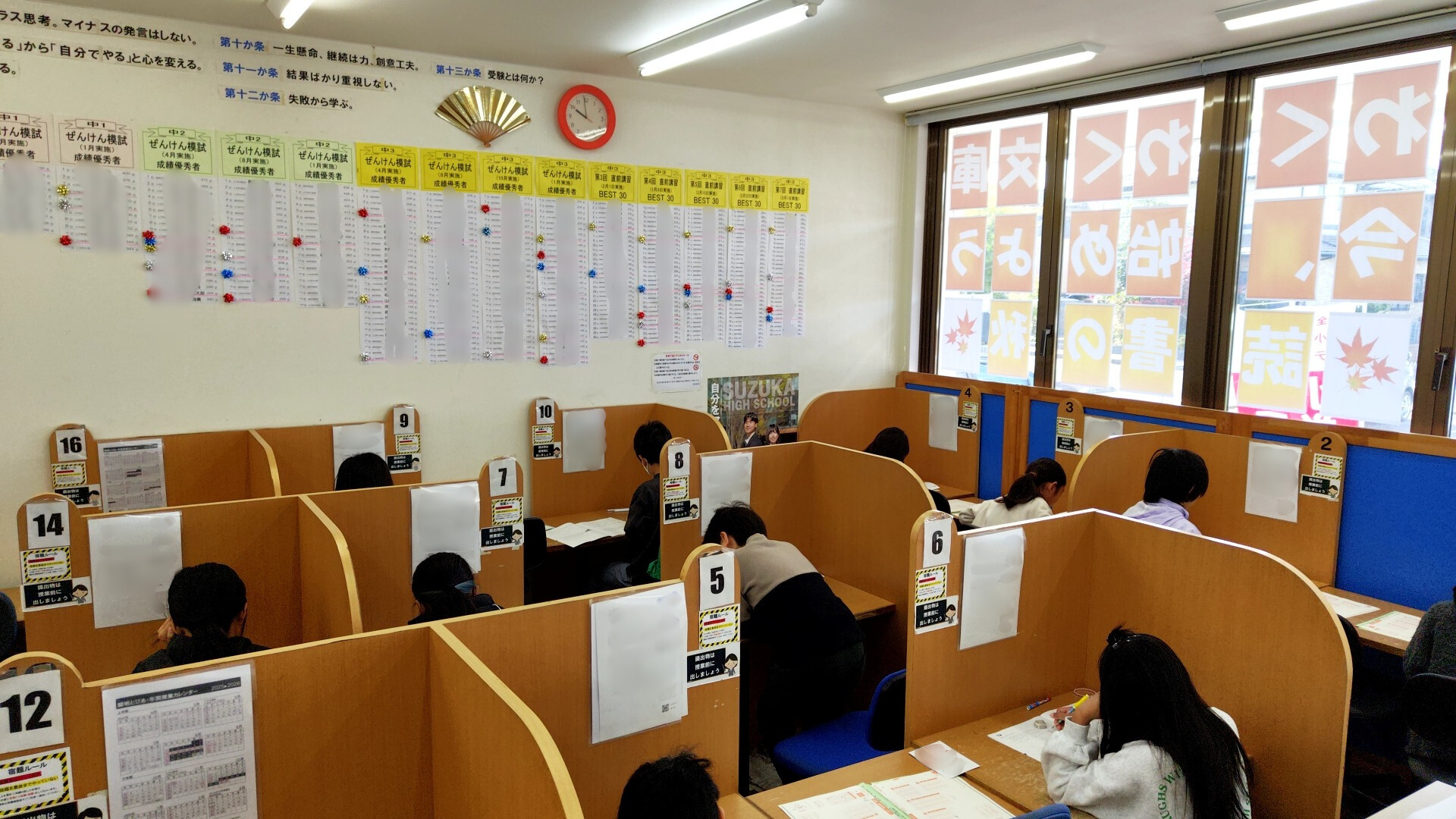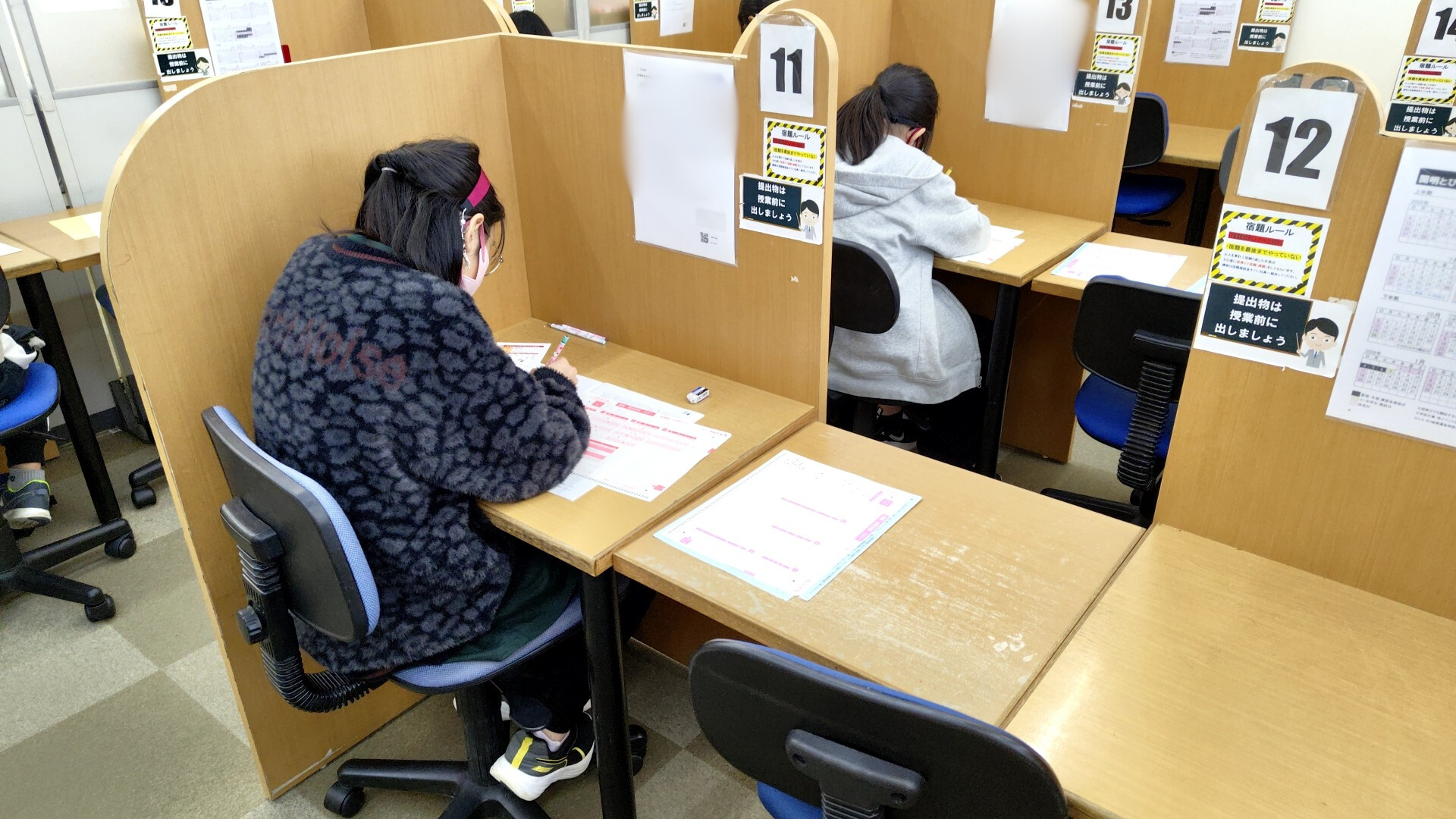 自習スペースでは学校の宿題や課題に集中して取り組むことができます。定期テスト前には多くの生徒さんが活用し、受験生は授業前後などに毎日利用しています。
