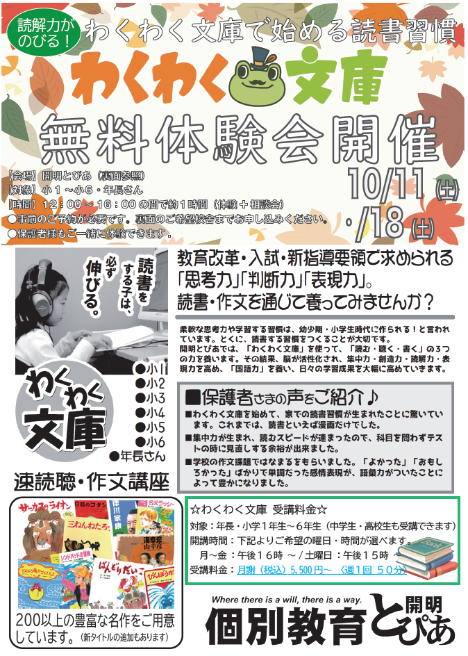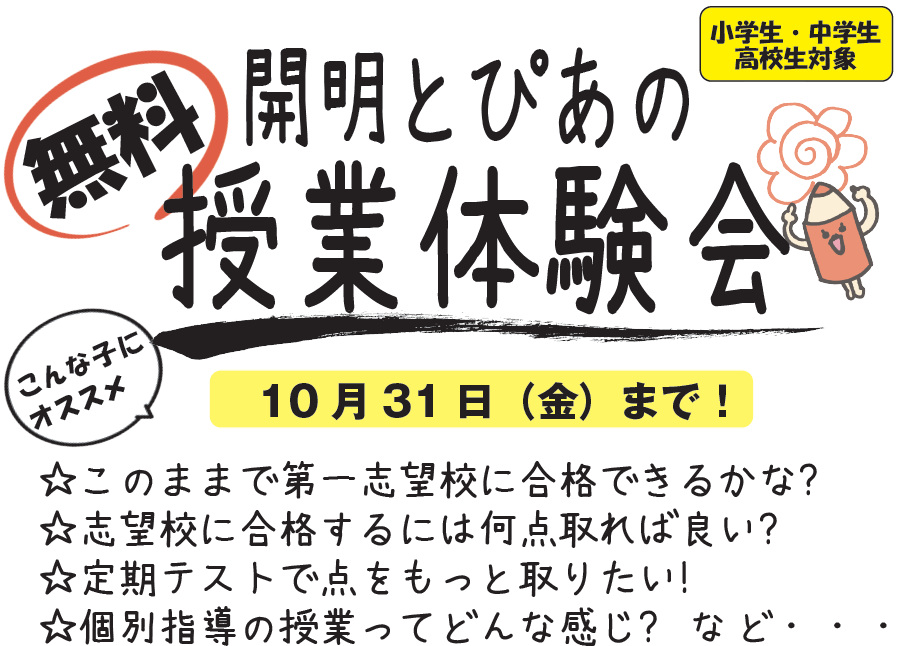 時間:個別面談にて決定(1コマ小学生…50分/中学・高校生80分)
