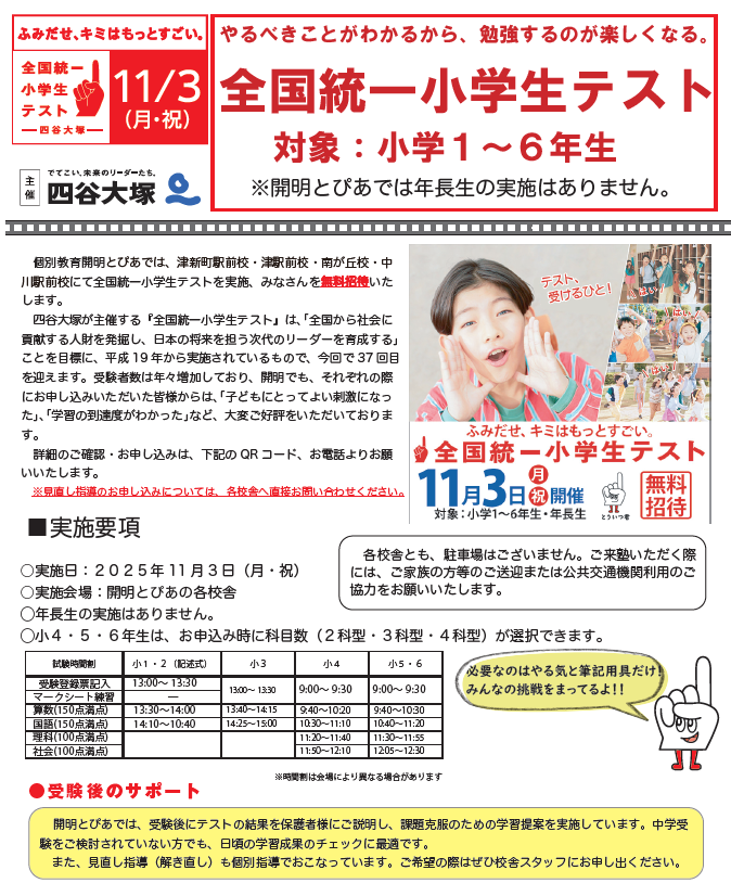 受験科目:英語または数学(算数)