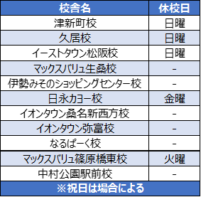 全校舎、1コマは60分で連続受講も可能です。朝・昼・夜も開いておりお仕事終わりやお休みの日にも通いやすい幅広い時間割となっております。復習、追加も可能です。また、ご都合が悪くなった際にはご予約の振り替えも可能です。休校日は上記の通りで時間割は各校舎により異なります。詳しくはこちらから各校舎のブログより時間割をご確認ください。