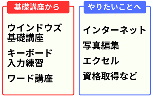 初心者の方でもやりたいことができるようになるコースです。パソコンを初めて触る、または久しぶりに触る方におすすめのコースです。パソコンの電源を入れる所からローマ字・文字入力、ワードが学べます。基礎講座が終了した後はインターネットや写真編集・エクセル・資格取得に進むことが可能です。基礎からしっかり学べますので、操作にも自信がつきます!